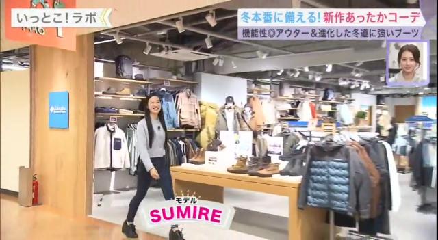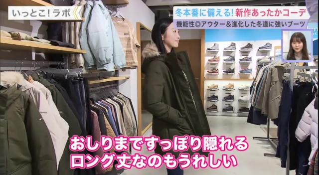 おすすめしていただいた全身コーデを試着したSUMIREさんは「かわいくて暖かいなんて最高ですね」と笑顔。