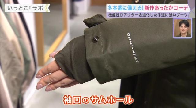 袖口にはサムホールが付いており、冷える手元の防寒対策にもなりますよ。