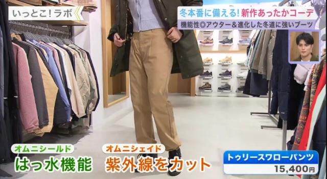 続いて、はっ水機能があるボトムス『トゥリースワローパンツ 15,400円(税込)』を試着。