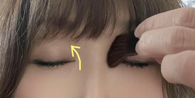 ブラシに適量を取り、鼻の付け根の窪みから目の窪みに沿っていれます。曲線を描くことで骨格に沿ったナチュラルな印象に。