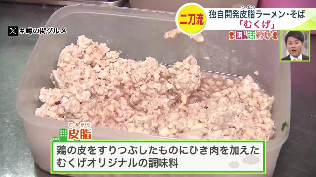 豚の背中部分の脂肪である背脂と違い、皮脂は母体の会社が独自に開発したもので、鶏独特の風味とさわやかな後味が特徴です。