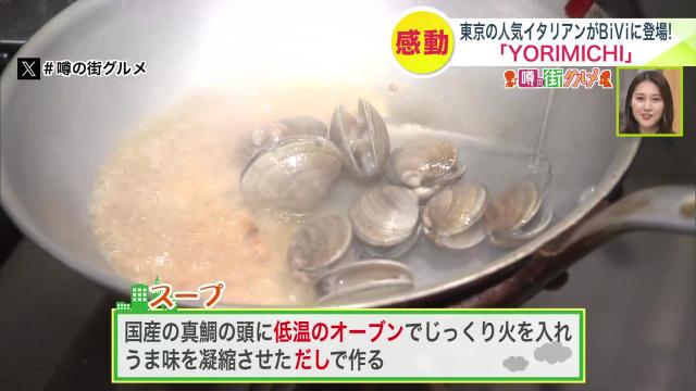 スープは、国産の真鯛の頭に低温のオーブンでじっくりと火を入れ、うまみを凝縮しただしで作っています。