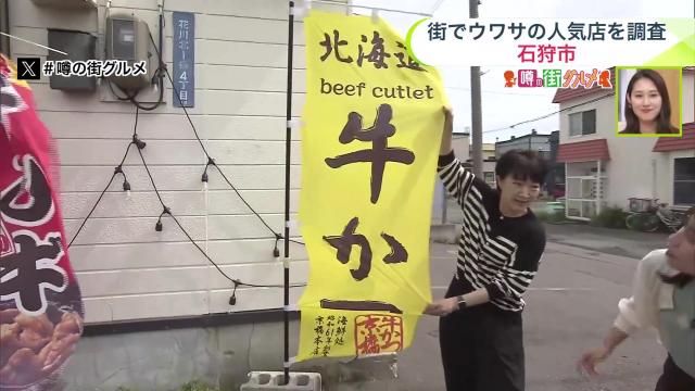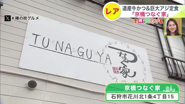 北海道ではなかなか見かけない「牛カツ」の文字。黄色いのぼりが目を引く「つなぐ家」。