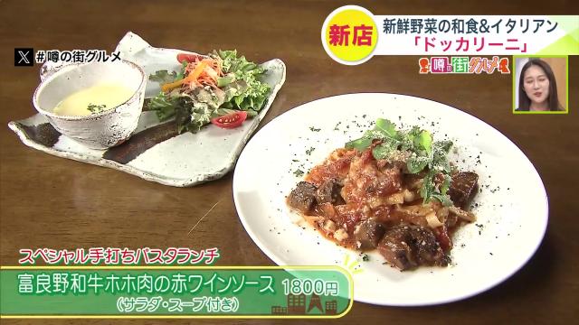 『富良野和牛ホホ肉の赤ワインソース 1,800円(税込)』は、サラダとスープが付いたスペシャル手打ちパスタランチ。