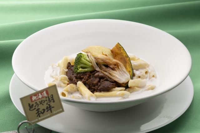 「とうや湖和牛腿肉と月浦ワインのハッシュドビーフソース」と「洞爺湖町産野菜のショートパスタクリームソース」の贅沢な組み合わせが魅力。とうや湖和牛の旨味が強い腿肉を月浦赤ワインとデミグラスソースで煮込み、洞爺湖町「健康工房とうや」の黒豆味噌を加えた奥深い味わいが特徴です。