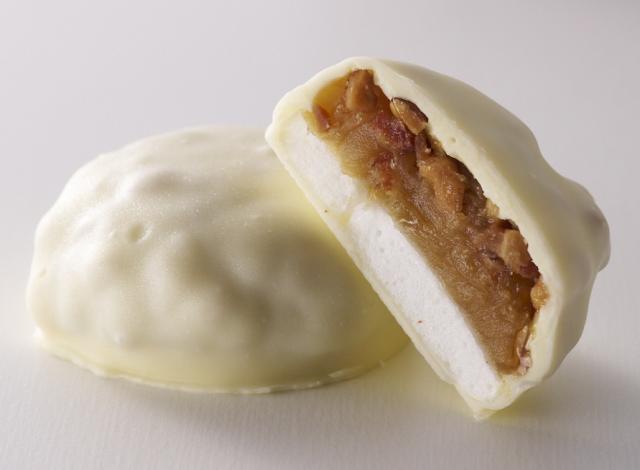 ふわっと食感のマシュマロに、濃厚でなめらかな北海道産由栗いも餡を合わせ、相性の良いホワイトチョコレートで包み込んだ一品。さつまいものやさしい甘みや、アーモンドの食感が広がります。