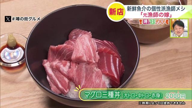 一番人気は、大トロ・中トロ・赤身がひと皿に盛られる「マグロ三種丼 2000円」です。時期によっては提供でいないこともあるようなので、あったらラッキー!