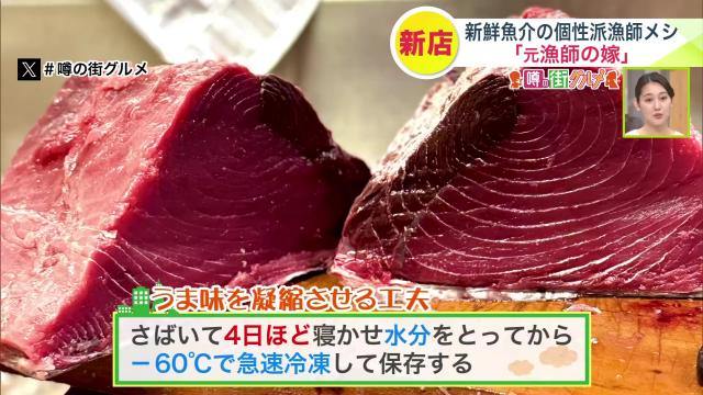 さばいてから4日ほど寝かせ水分をとってからマイナス60℃で急速冷凍をしているので、うまさが凝縮されるんですって。