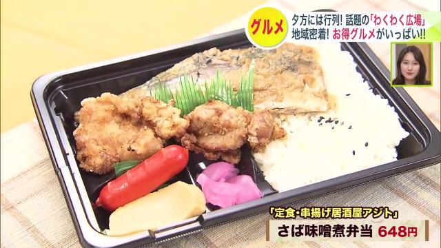 札幌白石区の「定食・串揚げ居酒屋アジト」の「さば味噌煮弁当」は、やわらかく煮たさばの味噌煮と唐揚げがどーんとのって、価格は648円。