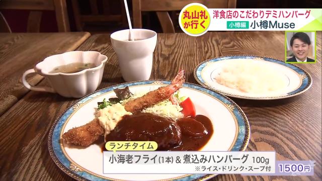 オススメの「小海老フライ(1本)&煮込みハンバーグ 100g」は、ライス・ドリンク・スープがついて1500円。
