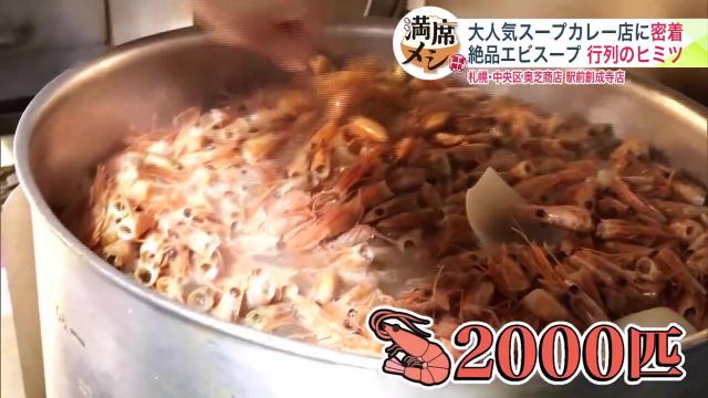 毎朝2,000匹分のエビの頭を、野菜と一緒に2時間ほど煮込んでスープを作っています。野菜と合わせることで甘みが引き立ち、風味豊かなスープに仕上がるのだといいます。