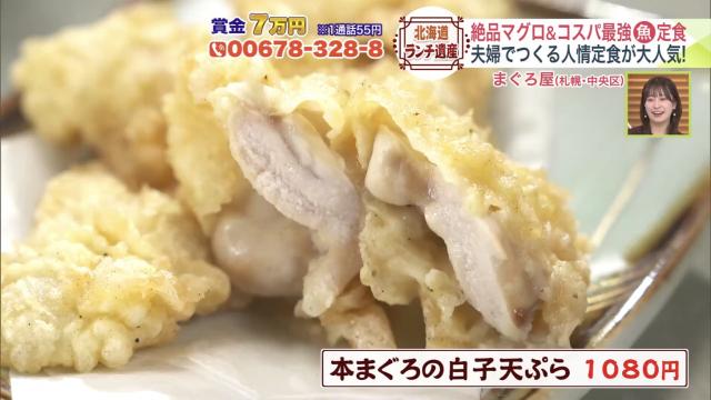 「本まぐろの白子天ぷら」(1080円)は、 松前産マグロの白子をカラッと揚げています。サケの白子よりも少し弾力があるそうです。