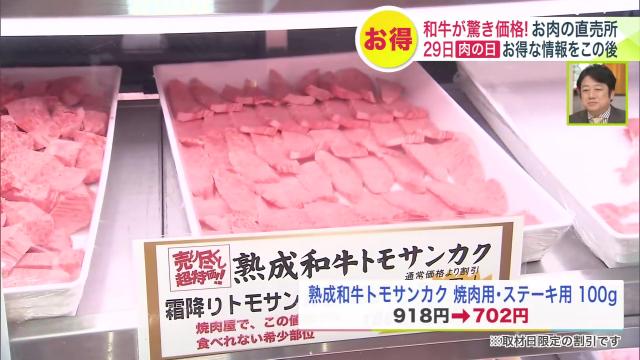 この日は、『熟成和牛トモサンカク 焼肉用・ステーキ用 100g』が918円から702円に値下げされていました。※取材日限定の割引です