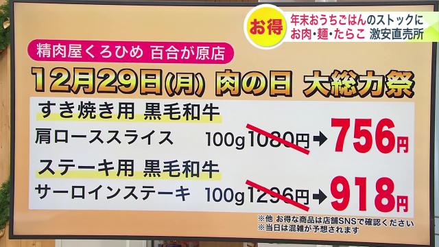 12月29日(月)の大総力祭では、『すき焼き用 黒毛和牛の肩ローススライス』が100g1,080円のところ756円に!