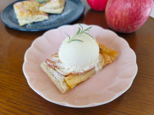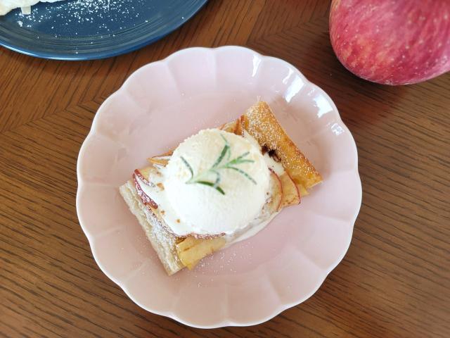 7.包丁でお好みのサイズに切り、器に乗せて粉糖を振りかけます。お好みでアイスクリームを乗せたら完成です。