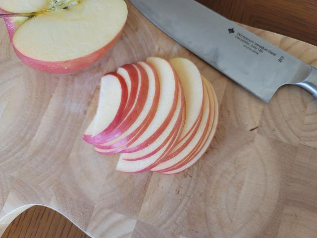 4.りんごはよく洗い、皮付きのまま薄切りにします。