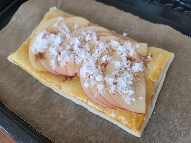 5.パイ生地が焼けたら、上に薄切りにしたりんごを少しずつずらしながら乗せ、砂糖、シナモンをりんごの上に散らします。
