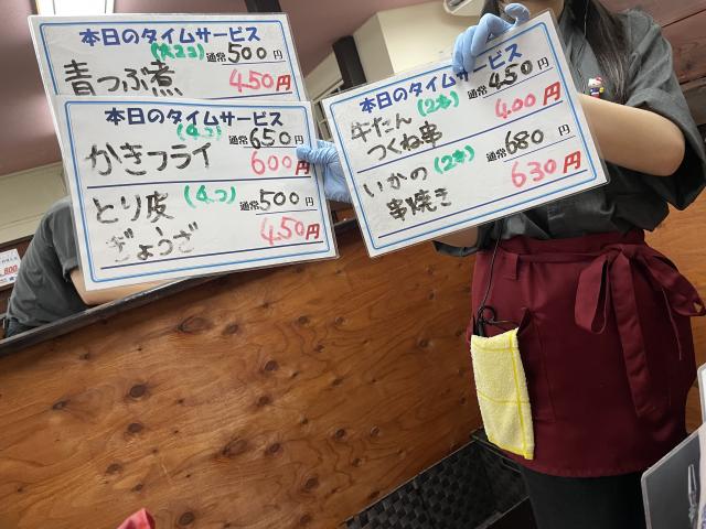 店員さんが「タイムセール」と書かれた小さなホワイトボードを持って店内を練り歩き、「青つぶ」や「鳥皮餃子」などがいつもよりも少しお得にいただける、遊び心のあるサービスが。