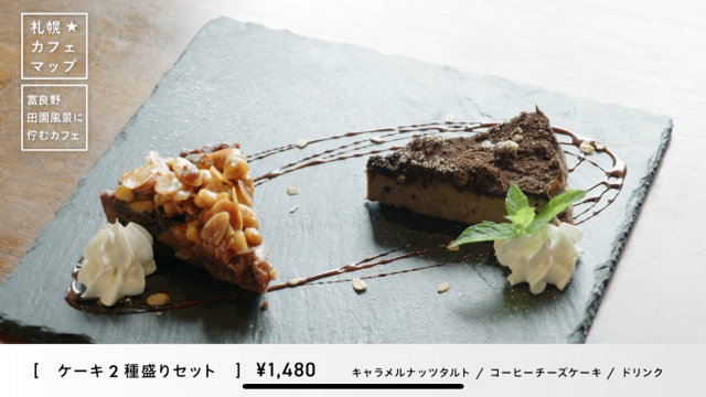 その中から、今回はキャラメルナッツタルトとコーヒーチーズケーキをチョイスして、「ケーキ2種盛りセット」(1480円、ドリンク付き)でいただきます。