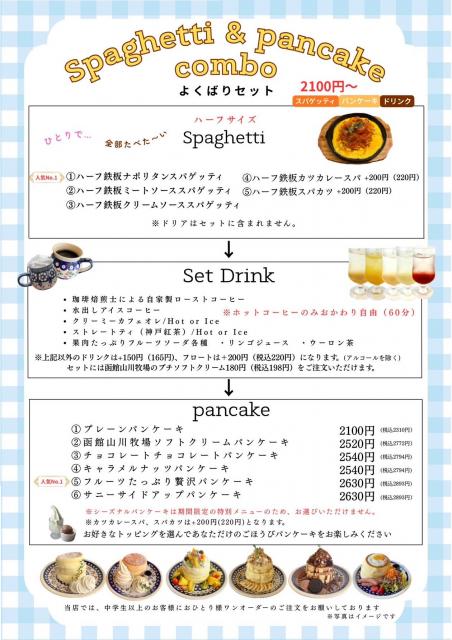 「パンケーキとスパゲッティ、どちらか一方なんて選べない!」という欲張りさんには、ハーフサイズの鉄板スパゲッティとドリンク、パンケーキが一度に楽しめる「よくばりセット 2,100円〜」もおすすめですよ。(よくばりセットでは、季節限定のパンケーキは対象外ですのでご注意ください!)