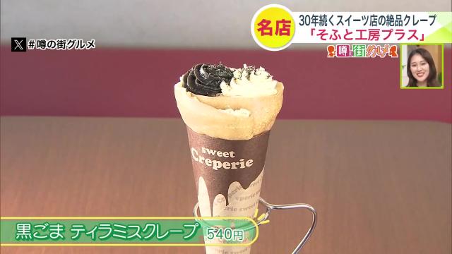 『黒ごま ティラミスクレープ 540円(税込)』は、マスカルポーネと黒ごまの濃厚な味わいがよく合う一品。