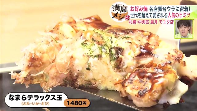 風月の定番メニューは「なまらデラックス玉 1,480円」。道産の豚肉、イカ、エビをふんだんに使った具だくさんのお好み焼きです。