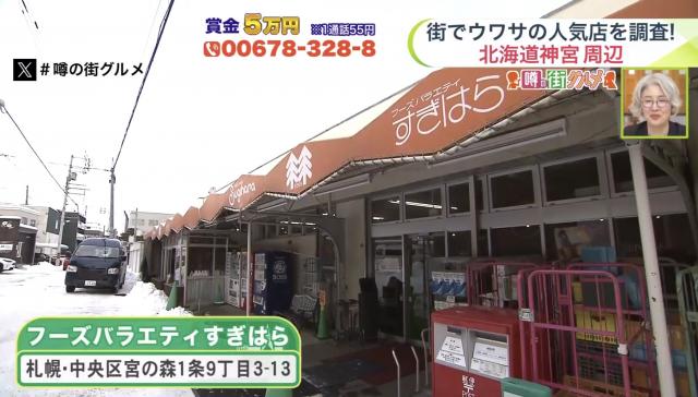 北海道神宮から歩いて来ると、見えてきたのは食料品スーパーの「フーズバラエティすぎはら」(札幌市中央区宮の森1条9丁目3-13)です。