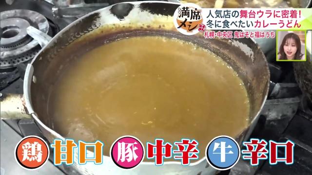 さらに、甘口は鶏肉、中辛は豚肉、辛口は牛肉とそれぞれスープのベースも異なります。豚には一番だし、牛には二番だし、そして鶏には豆乳をプラスしています。