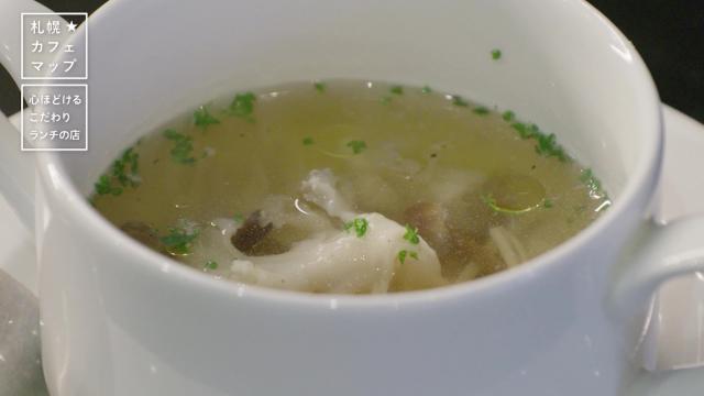 ハナビラタケ、エノキ、カキノキダケの3種のキノコのスープは、「キノコにおぼれそうなくらい、本当にいい香りがしています」と柴田アナウンサー。