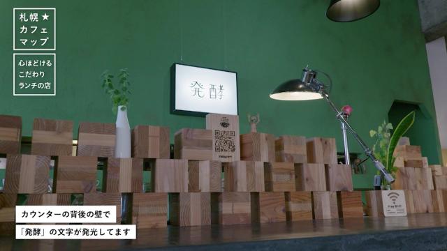 カウンターの背後の壁で「発酵」の文字が発光しています