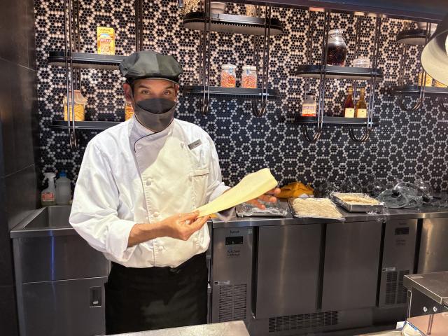 伸ばした生地をリズムよく空中で回し、オーブンへ。香ばしく焼き色のついたナンは、