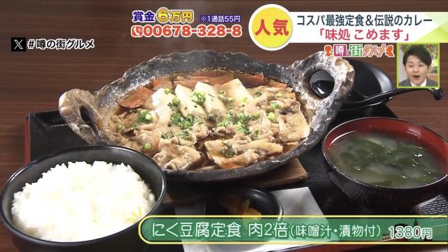 取材で訪れた田辺桃菜アナウンサーの前に、グツグツと音を立てながら運ばれてきたのは「にく豆腐定食 肉2倍」(1380円、みそ汁・漬け物付き)。