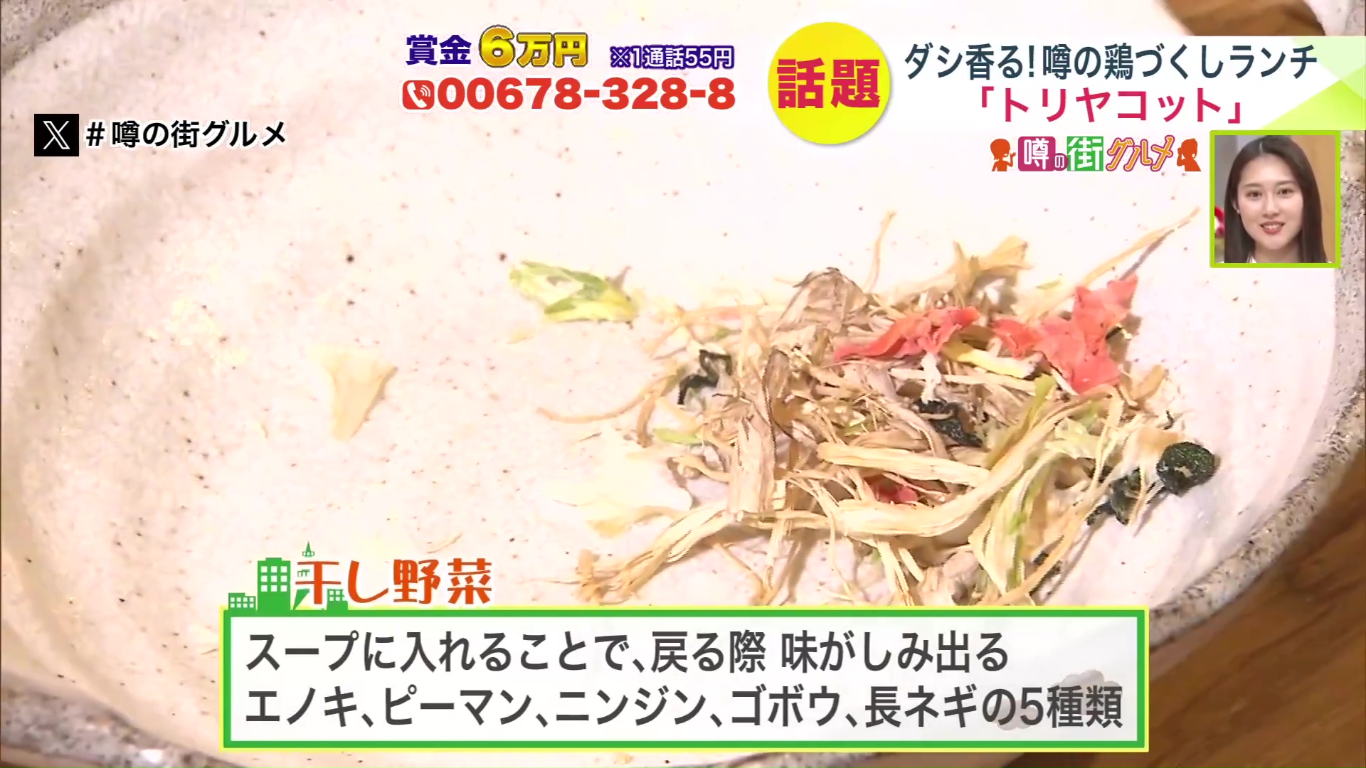 おいしさの秘密は、エノキ、ピーマン、ニンジン、ゴボウ、長ネギの5種類の干し野菜を入れること。戻したときにスープに野菜のうまみが溶け出てくるのだそう。