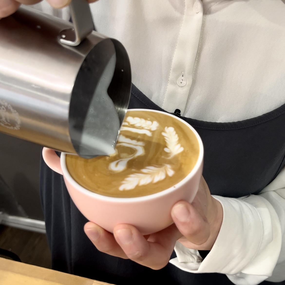今回のラテアートは「フリーポアラテアート」というもので、ピックやスプーンなどは使用せずにスチームミルクを注ぐだけで模様を描くラテアートです。