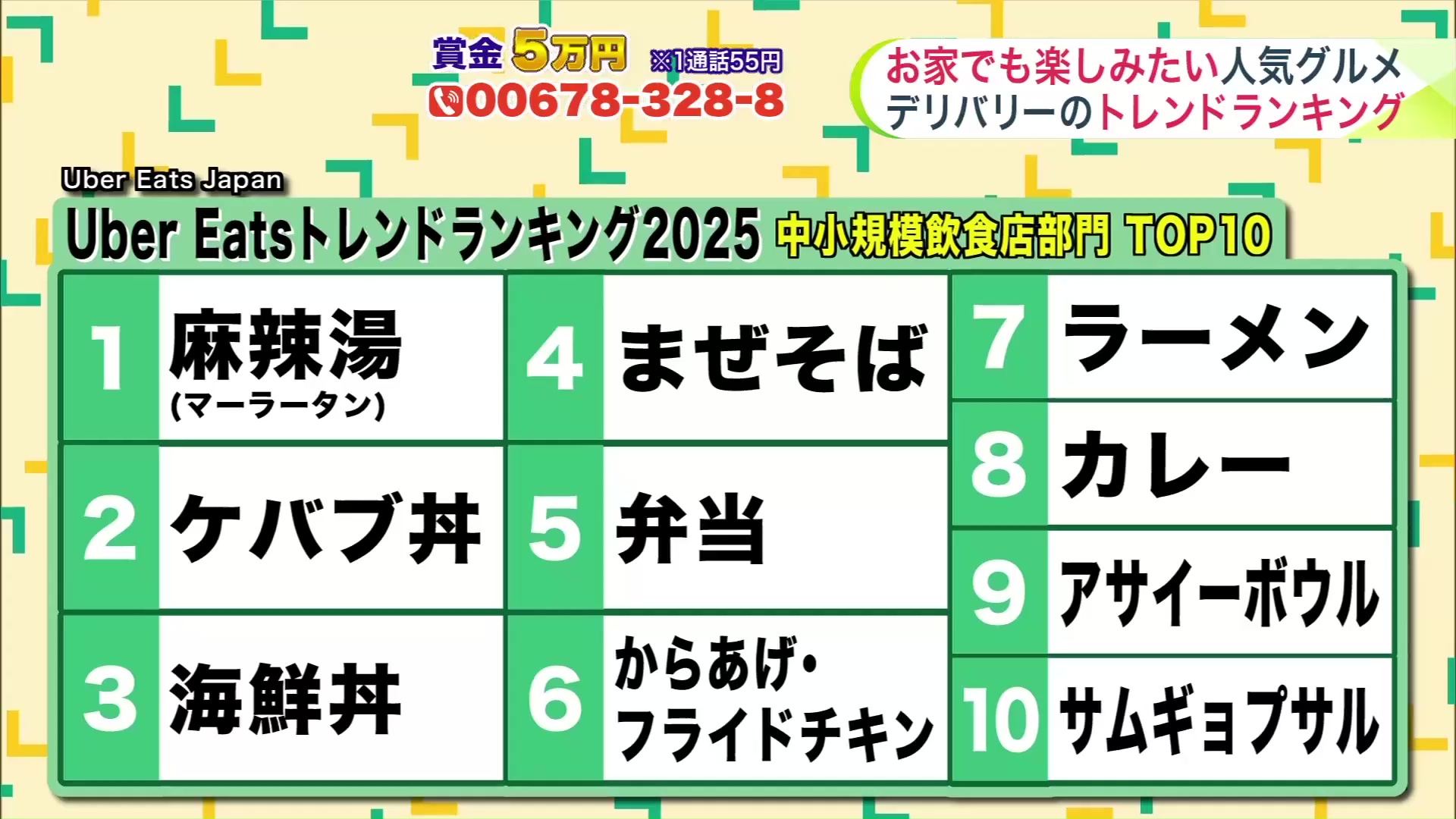 Uber Eats Japanが発表した「Uber Eatsトレンドランキング2025」。中小規模飲食店部門のTOP10には麻辣湯やケバブ丼、まぜそばなどさまざまなメニューがランクインしています。