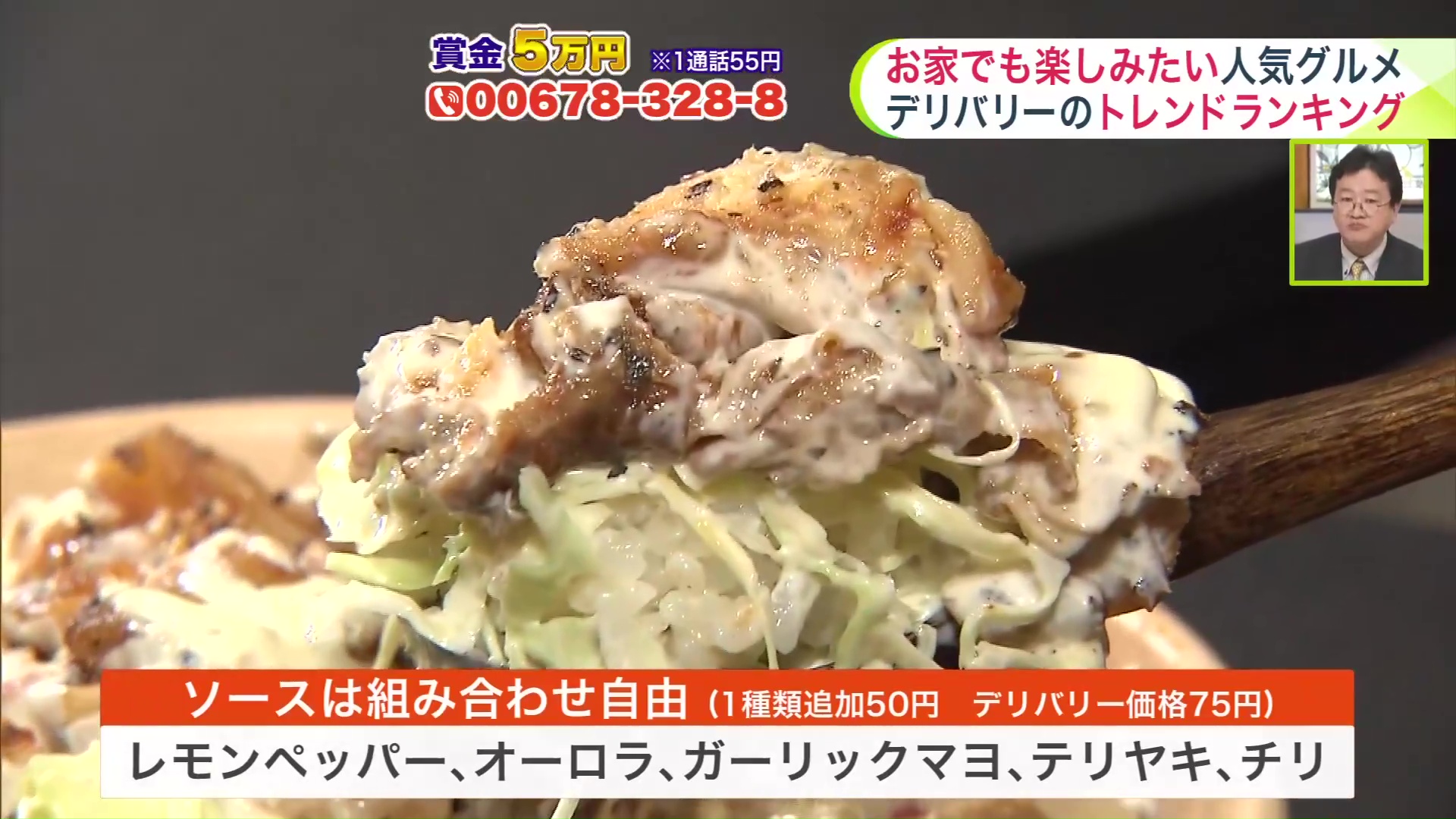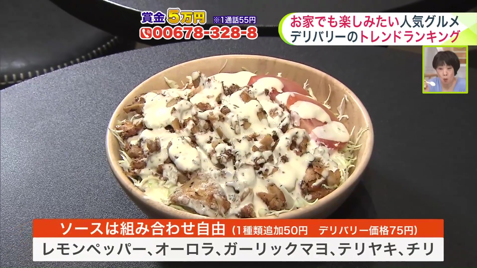 ソースは食い合わせ自由で1種類追加50円(デリバリー価格75円)。レモンペッパー、オーロラ、ガーリックマヨ、テリヤキ、チリから選べます。