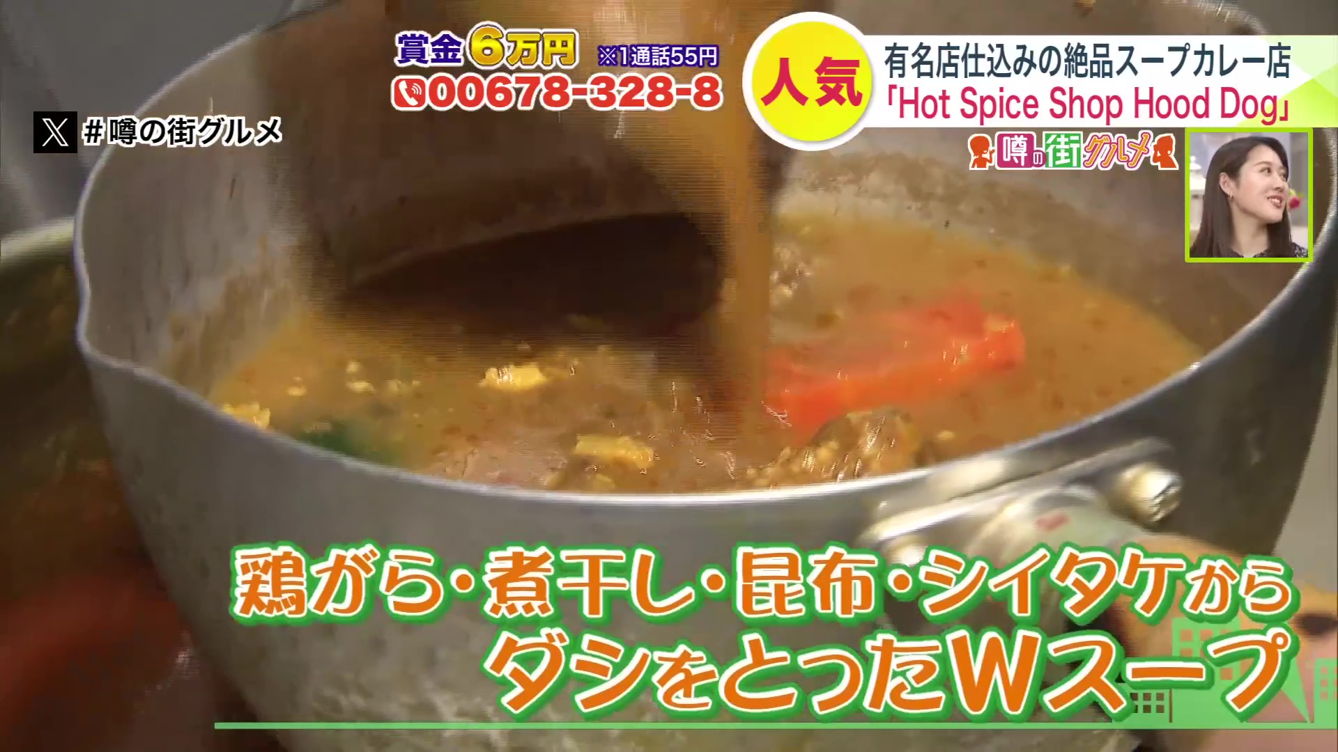 鶏ガラ、煮干し、昆布、しいたけからとった出汁のWスープをベースに、辛さや香りづけ、味付け用と3段階に分けられた19種類のスパイスを加えて仕上げたスープ。