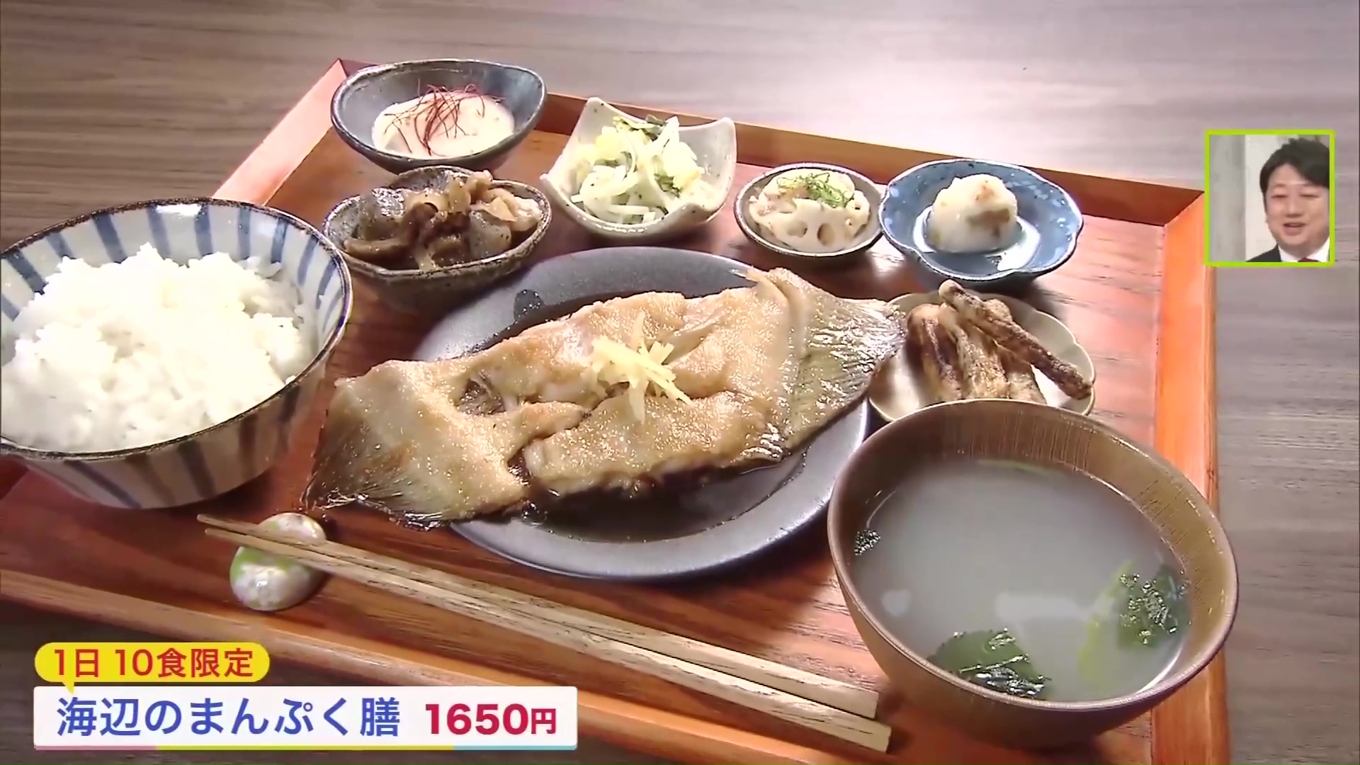 1日10食限定の「海辺のまんぷく膳(1650円)」は、カレイの煮つけをメインに、たくさんの小鉢がのっています。