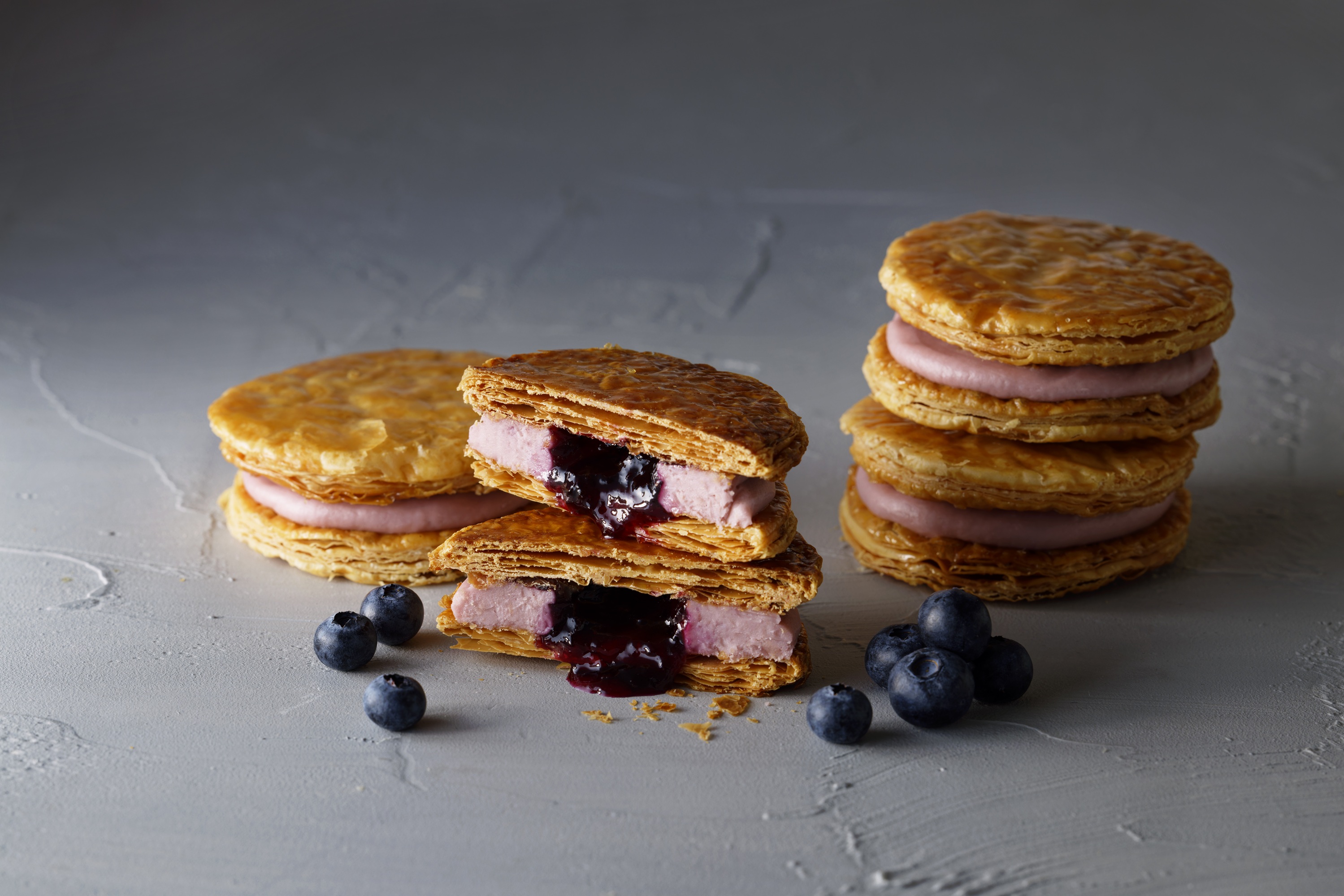 ザクリとした独特の食感に、ブルーベリーフィリングととろ〜りソースが閉じ込められた、冷やして食べるタイプのパイ。