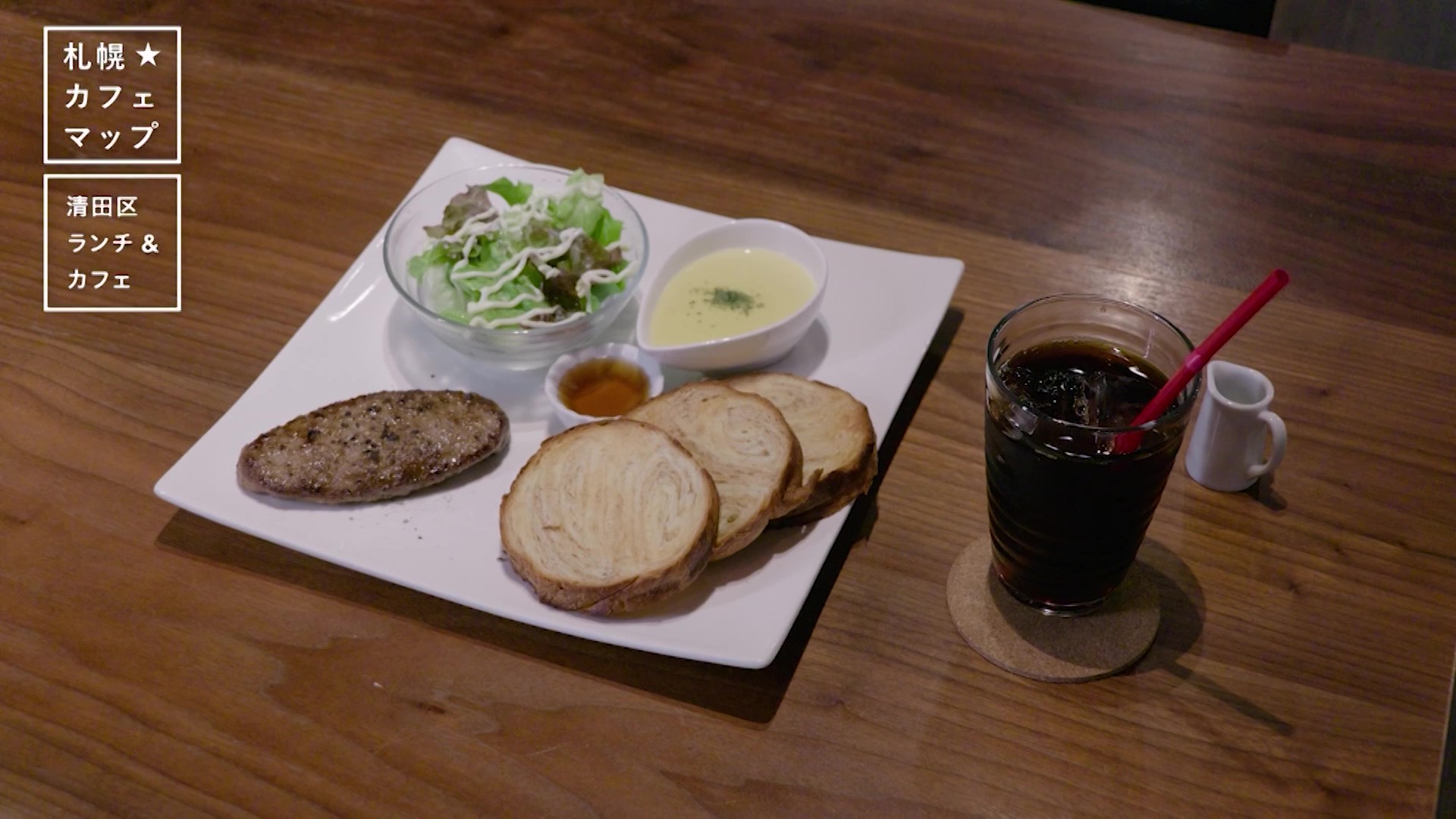 コーンクリームスープとサラダ、ドリンクまで付いていて、大満足のセットです。