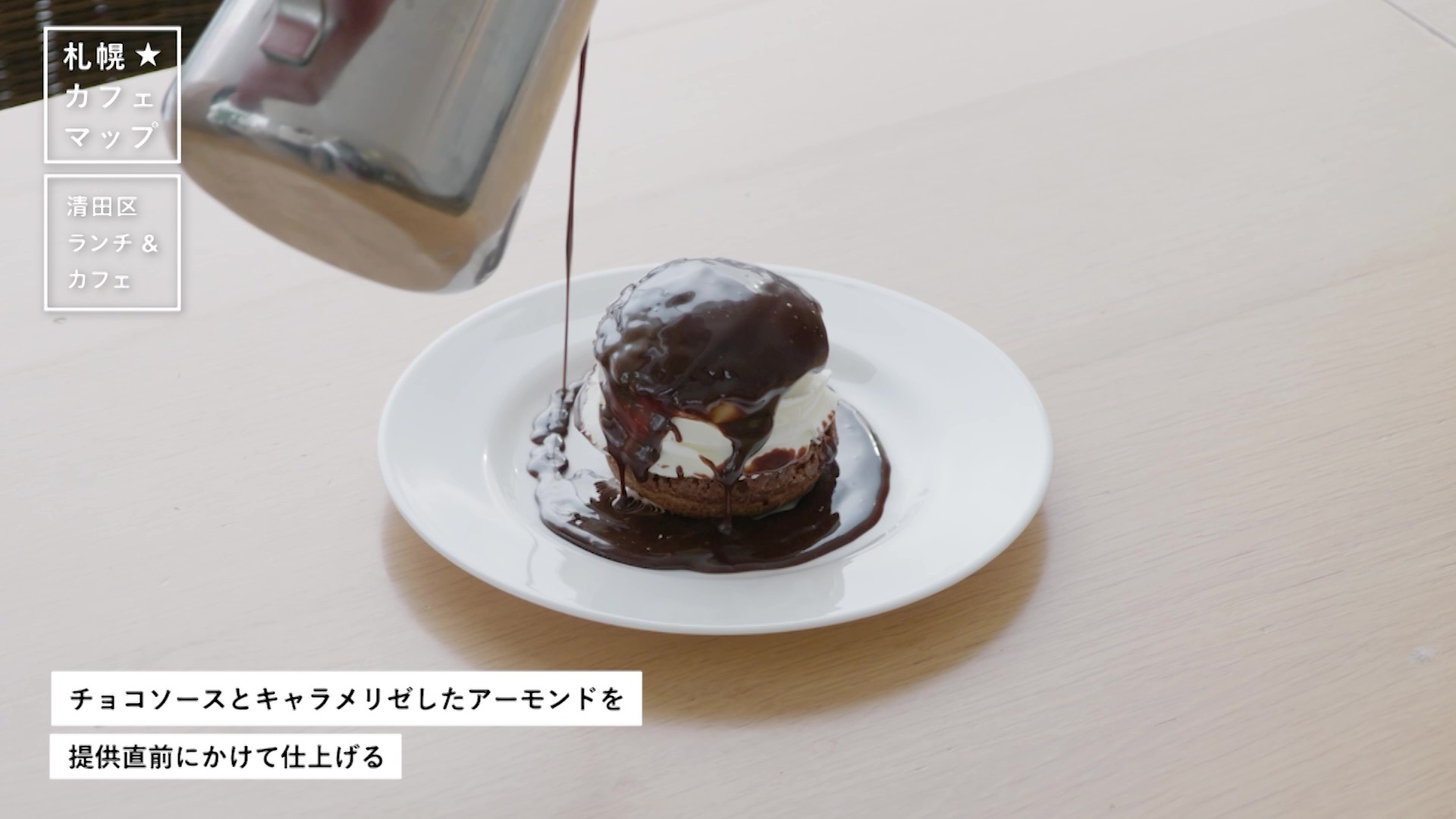 サクッとしたショコラシューの中に、自家製バニラアイスや生クリームが! さらに、温かなチョコレートソースを上からたっぷりかけた一品です。