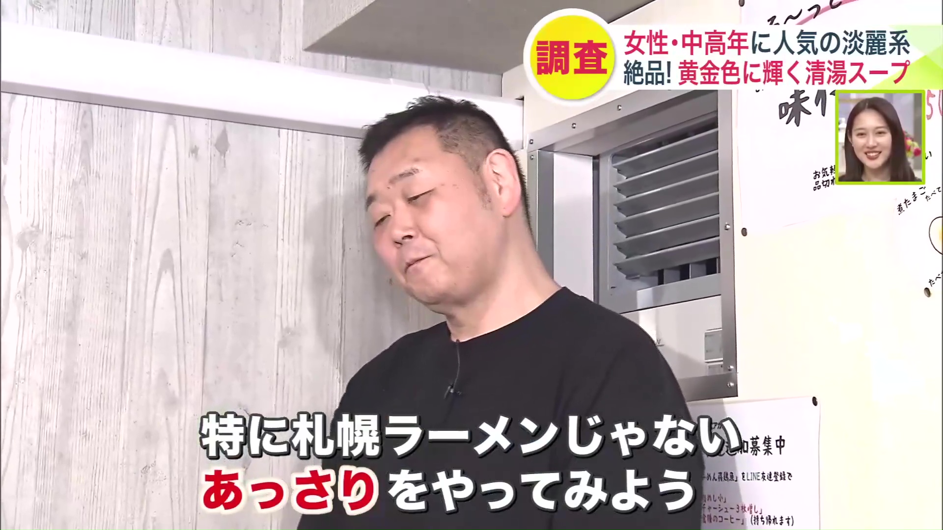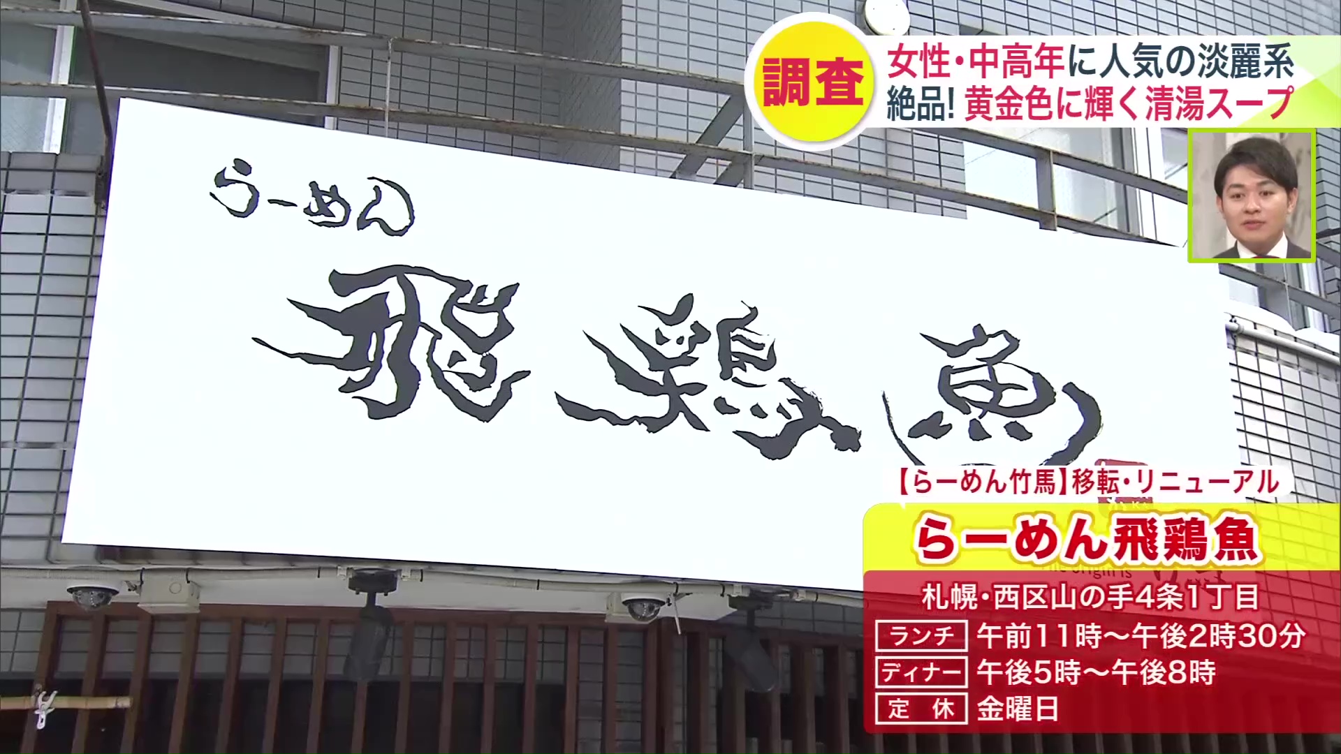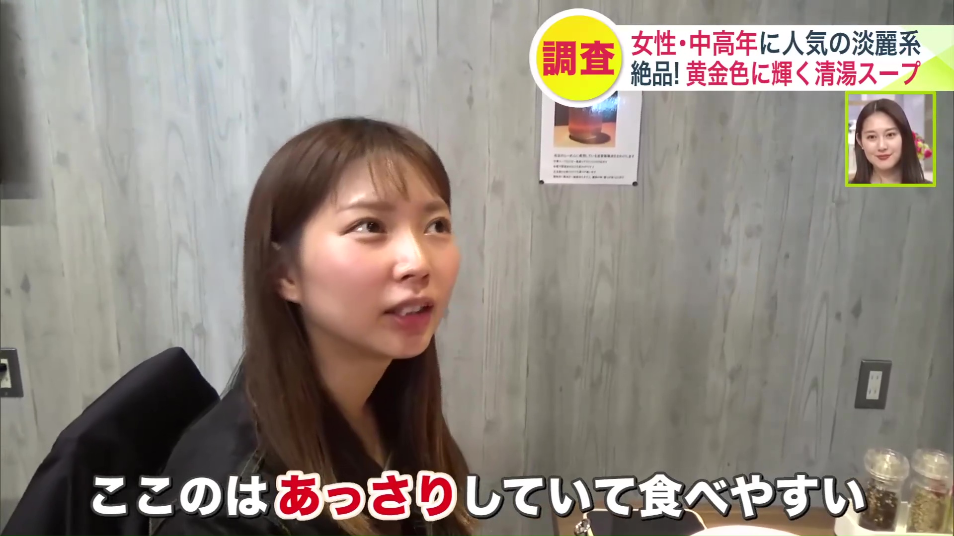 透き通ったあっさりしたスープが人気で、宇野アナの注目のお店が「らーめん飛鶏魚(とさか)」。