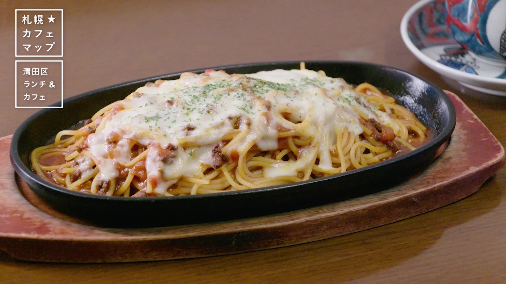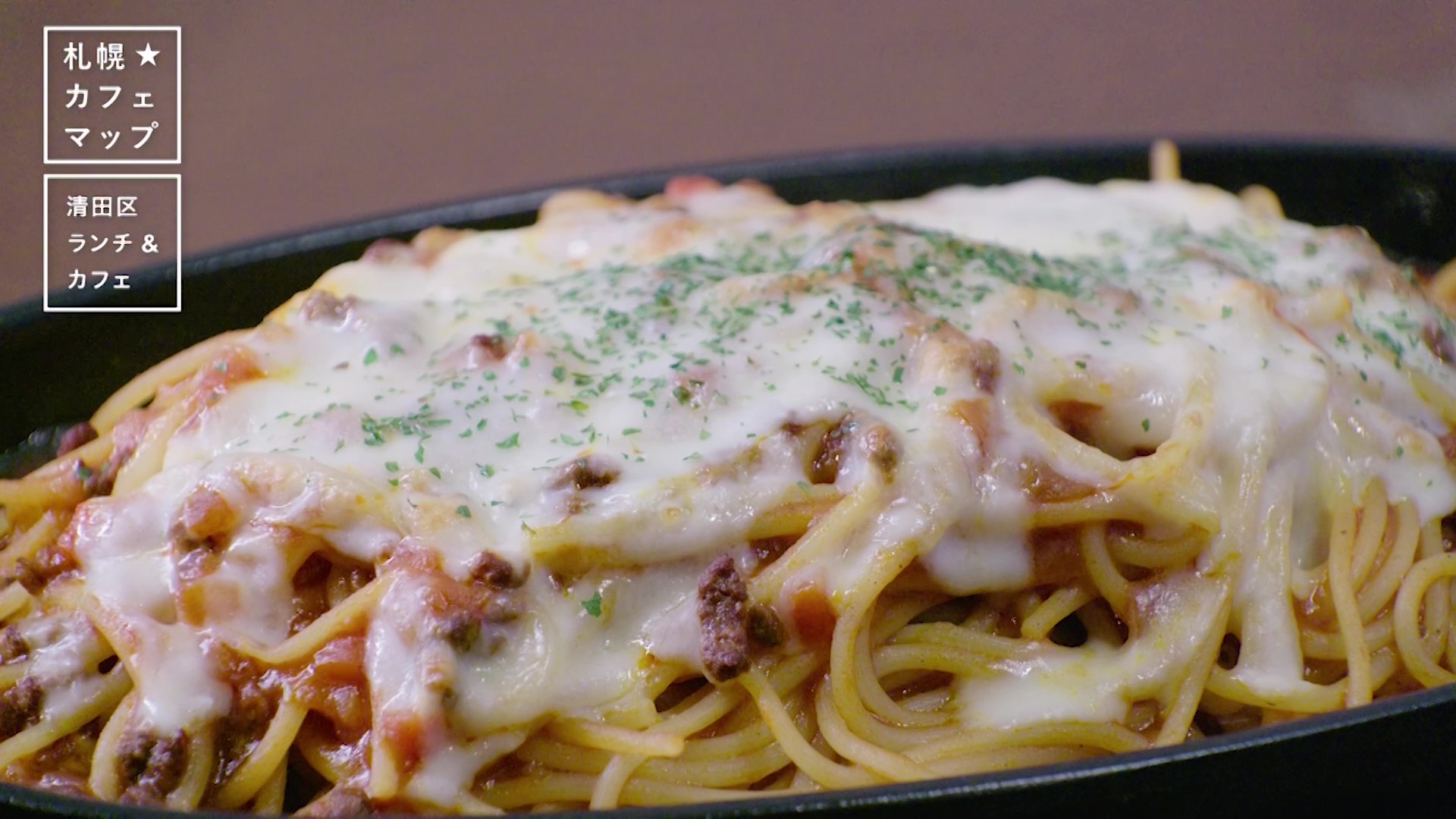 ひき肉のうま味やトマトの酸味が効いたミートスパゲティの上に、チーズがとろりと絡み、間違いないおいしさ! 常連客にも愛される一品です。
