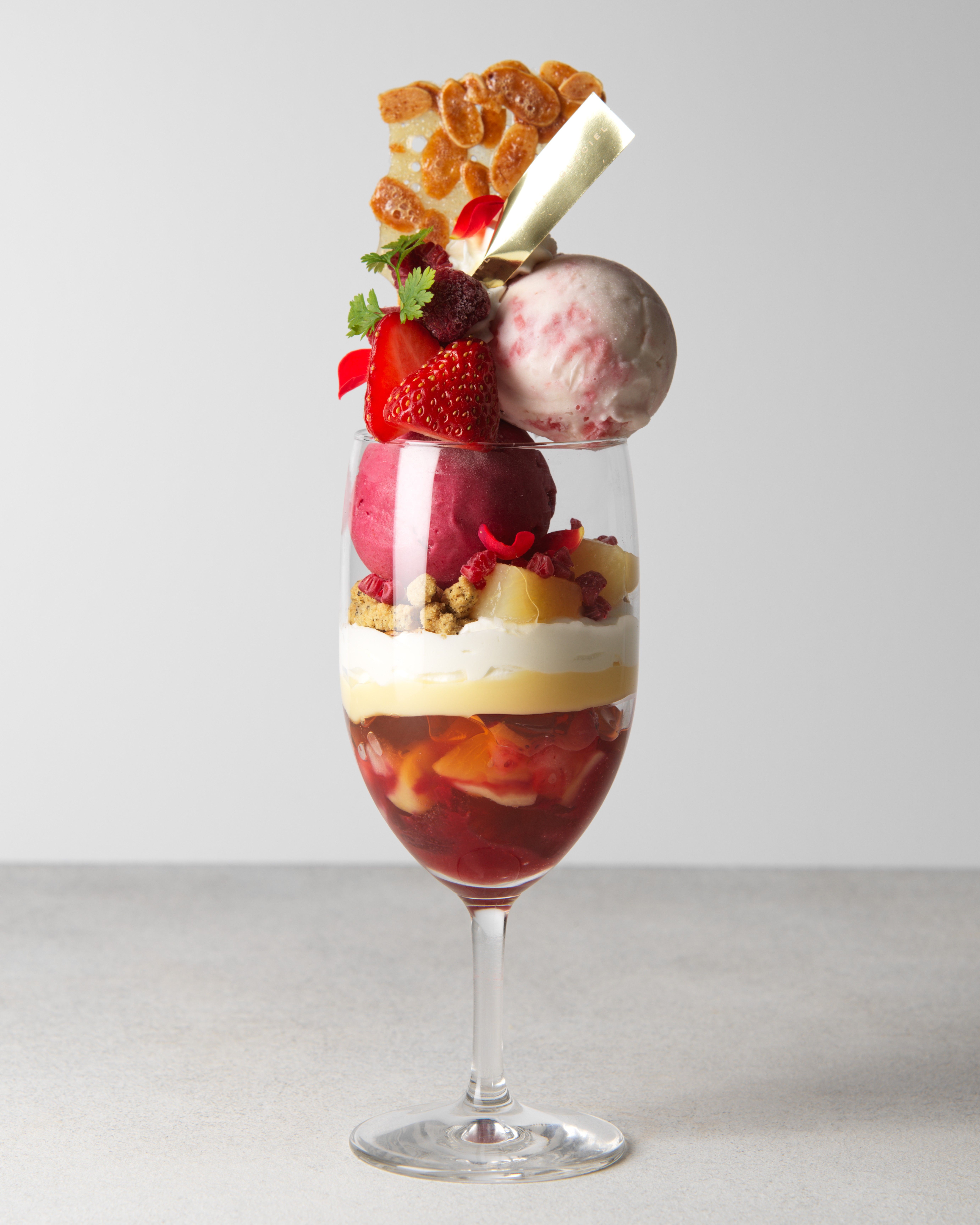 赤桃と白桃2種類のアイスを使用し、恋香桃と苺のダイス、甘酸っぱいベリーソース入りのフルーツティージュレを忍ばせた層が続きます。