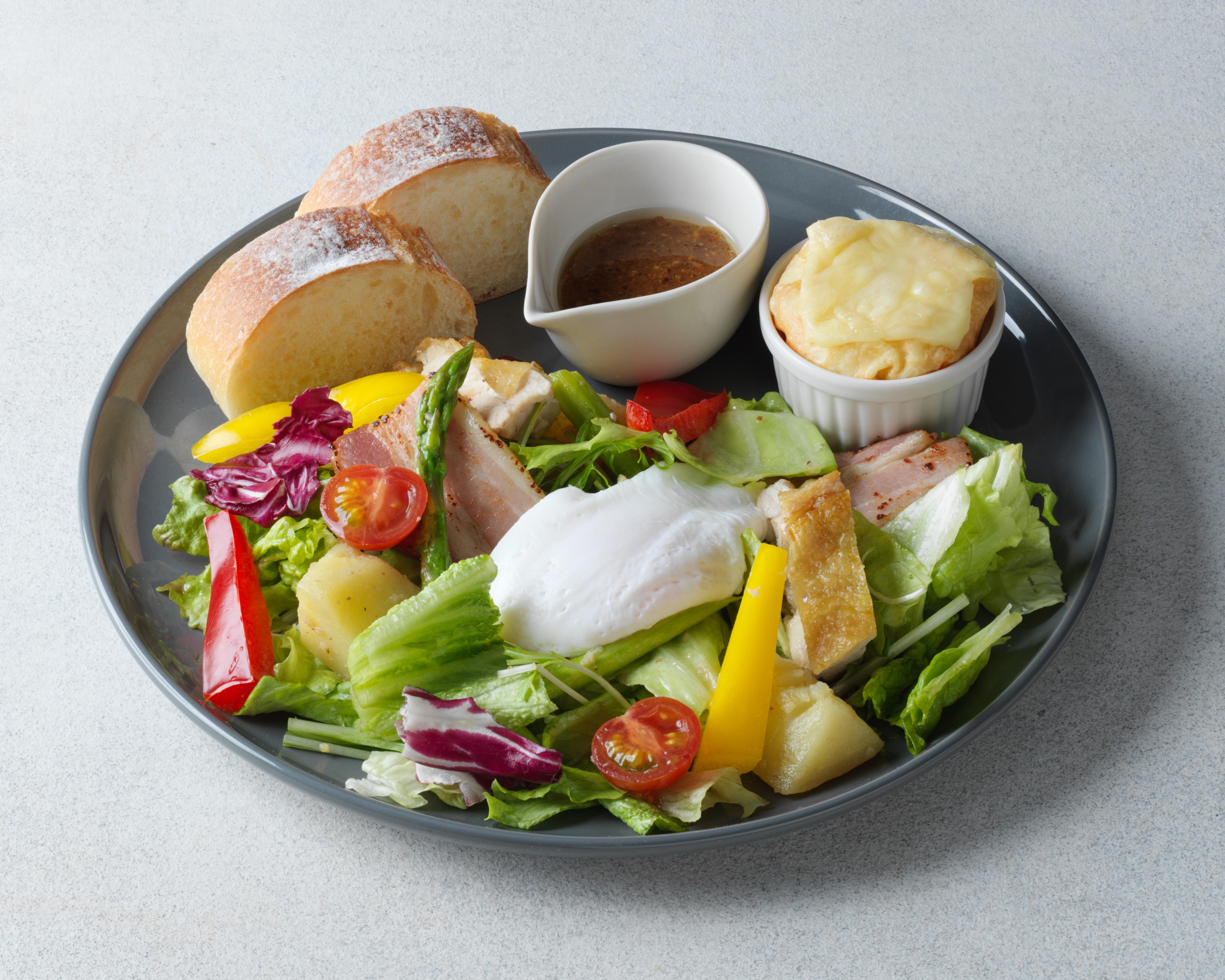 「季節のサラダプレート ~春野菜と蟹クレープグラタン~」1,760円(税込)は、春キャベツ・じゃがいも・アスパラなど旬野菜にジューシーなベーコンと鶏もも肉を合わせた一皿。