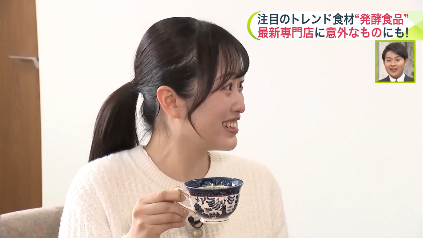 取材で試飲した板橋未悠アナウンサーは「後味がかなりすっきりしている感じがします。ナッツのような、キャラメルのような甘みも感じられます」と驚いた様子。