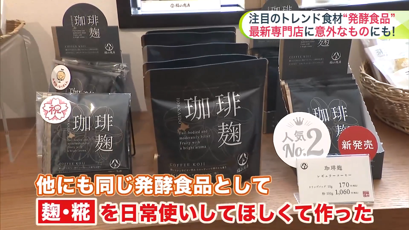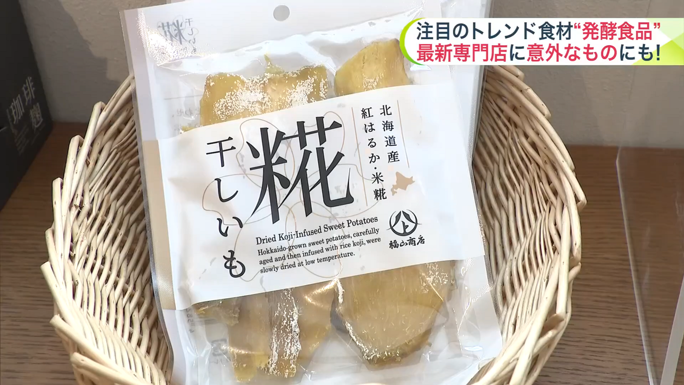 福山醸造は他にもさまざまな発酵食品をプロデュース。ふりかけて食べる道産米の「糀(こうじ)パウダー」(200グラム、910円)や、柔らかな食感の「糀干しいも」(700円)、「糀いちごみるくドロップス」(490円)などがあり、売り上げを伸ばしています。