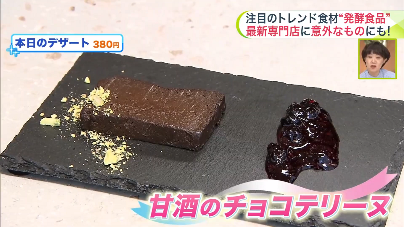 さらに、「本日のデザート」(380円)にも発酵食品が使われています。「甘酒のチョコテリーヌ」は、カカオ55%のチョコに甘酒で甘さを加えた一品。