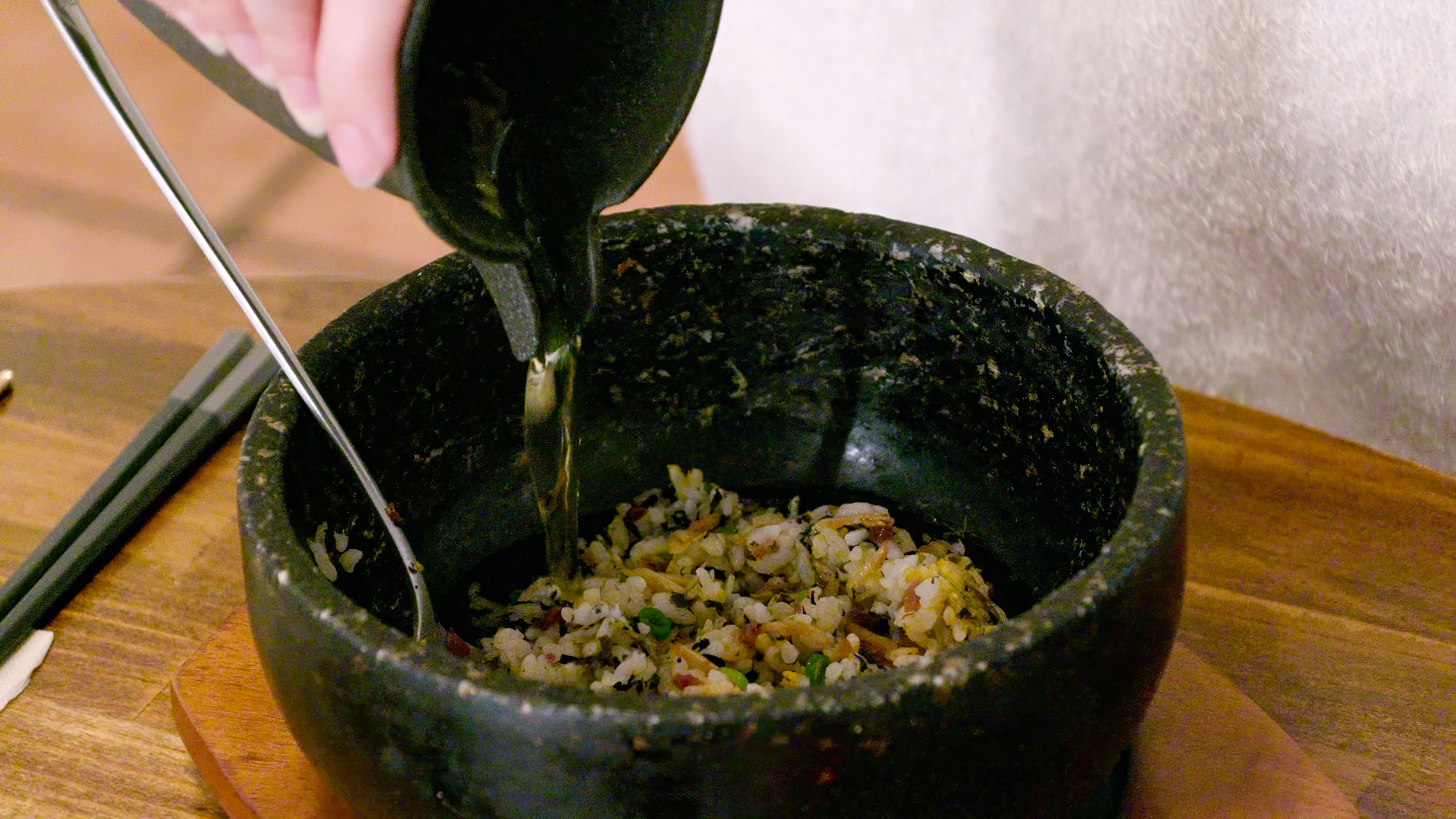 利尻昆布と干しエビのだしを注ぐと、香りやうま味がぐんとアップ。食感の変化もおいしさのポイントです。