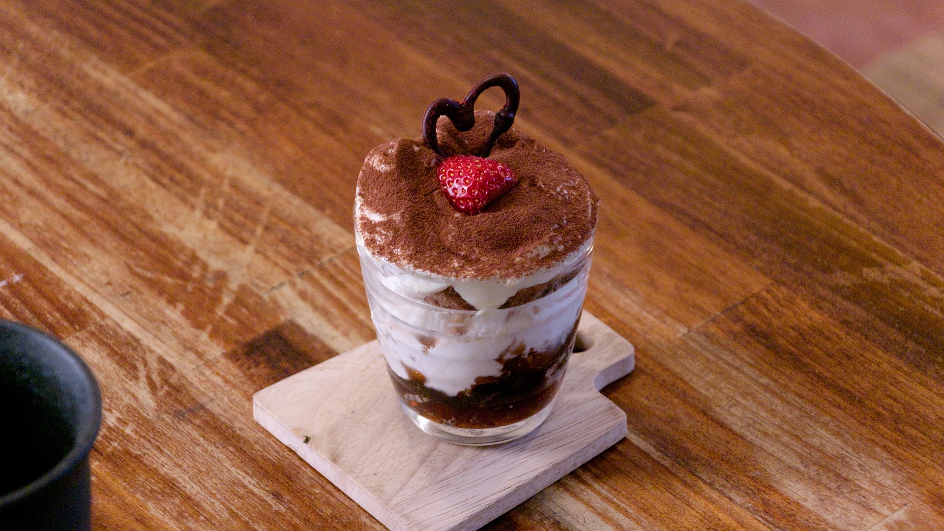 デザートには、一番人気のティラミスパフェを。おなかも心も満たされる最高の時間です。